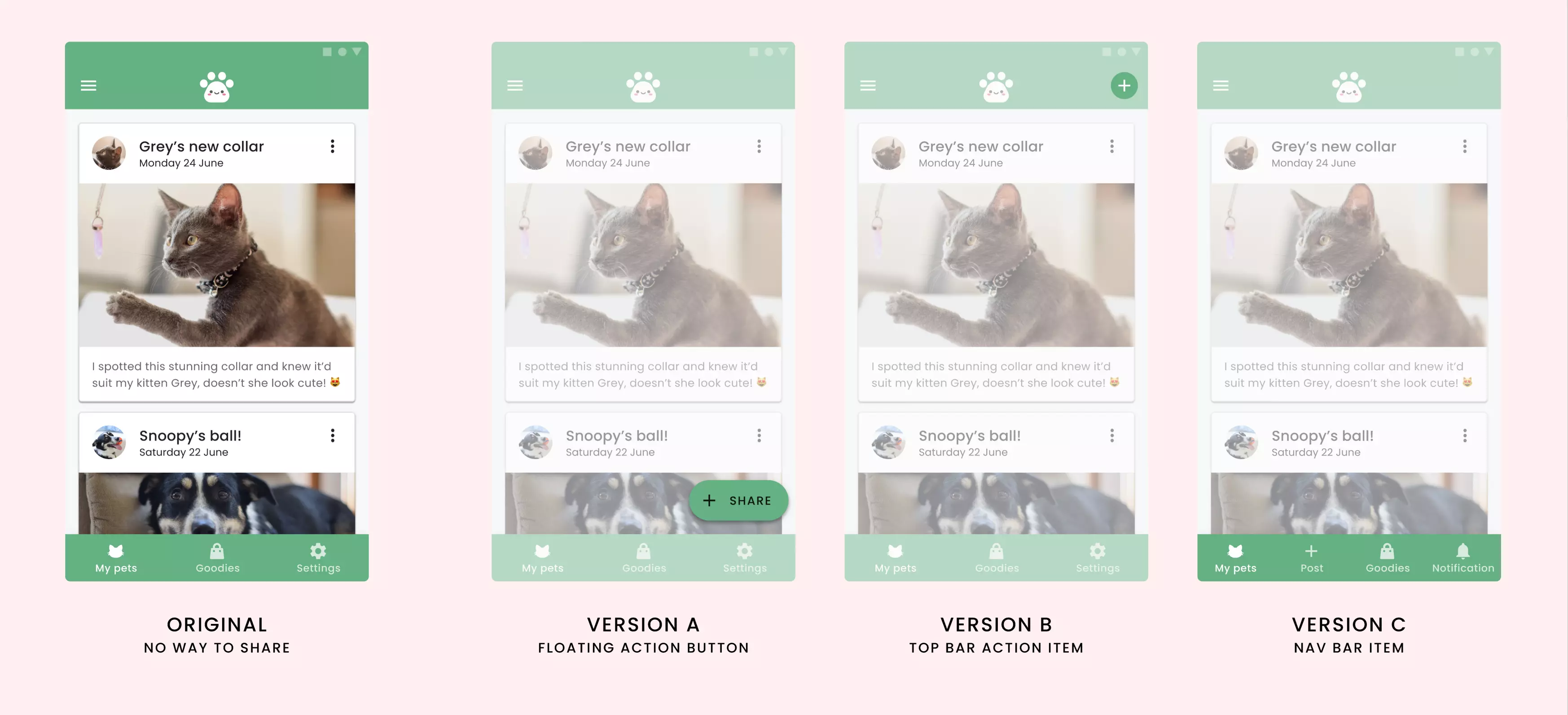 As the sole designer on the team, my role was to help improve their new social feed. This feature helps pet owners to share their recent purchases with other Petsy members.