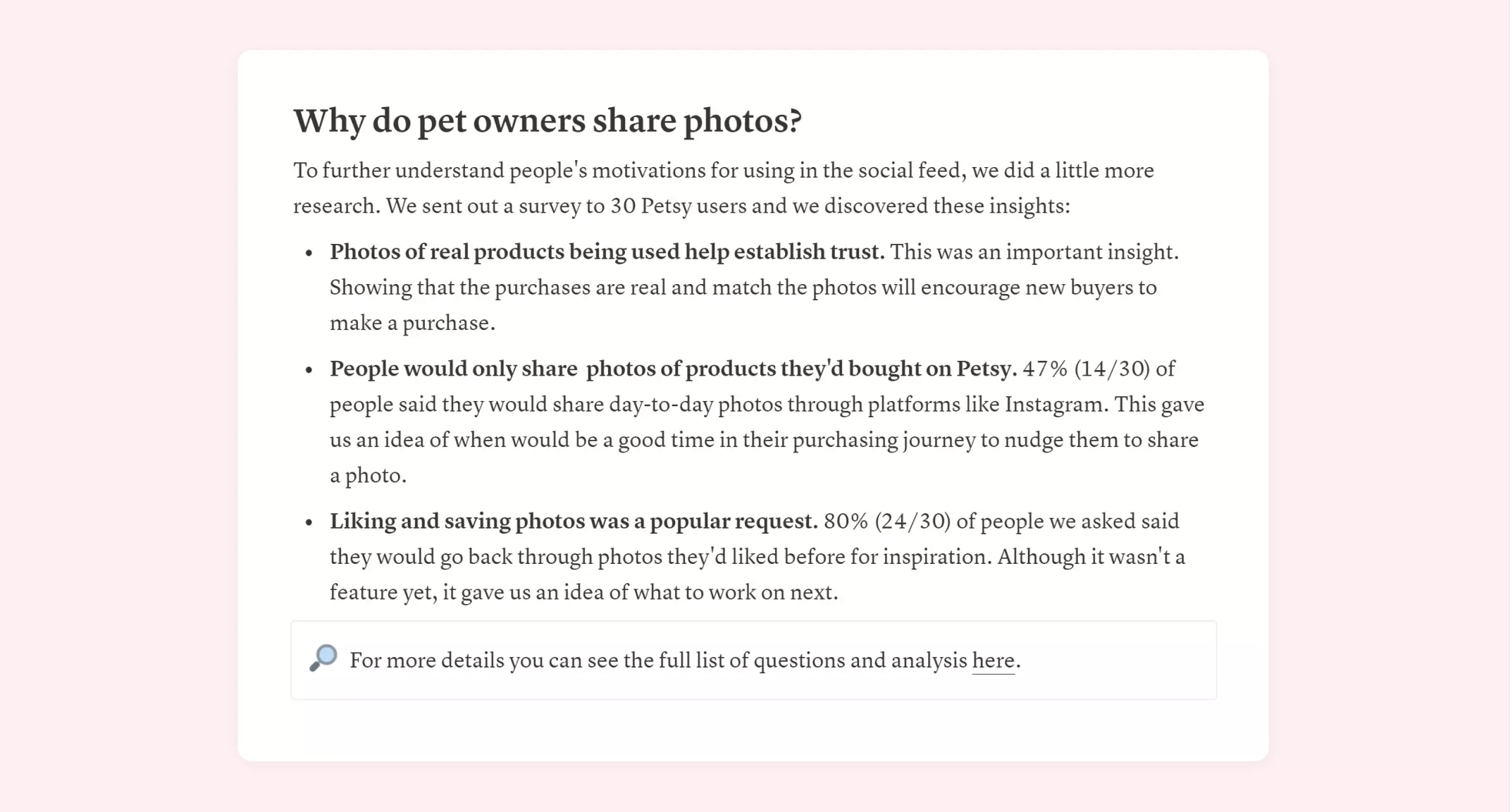 The example I used in my Petsy case study describes a survey sent out to users to understand why they wanted to upload a photo in the first place. I chose the survey because it’s a quick way to get tangible feedback. The results from the survey justified the design direction and gave us insights to use for future product developments.